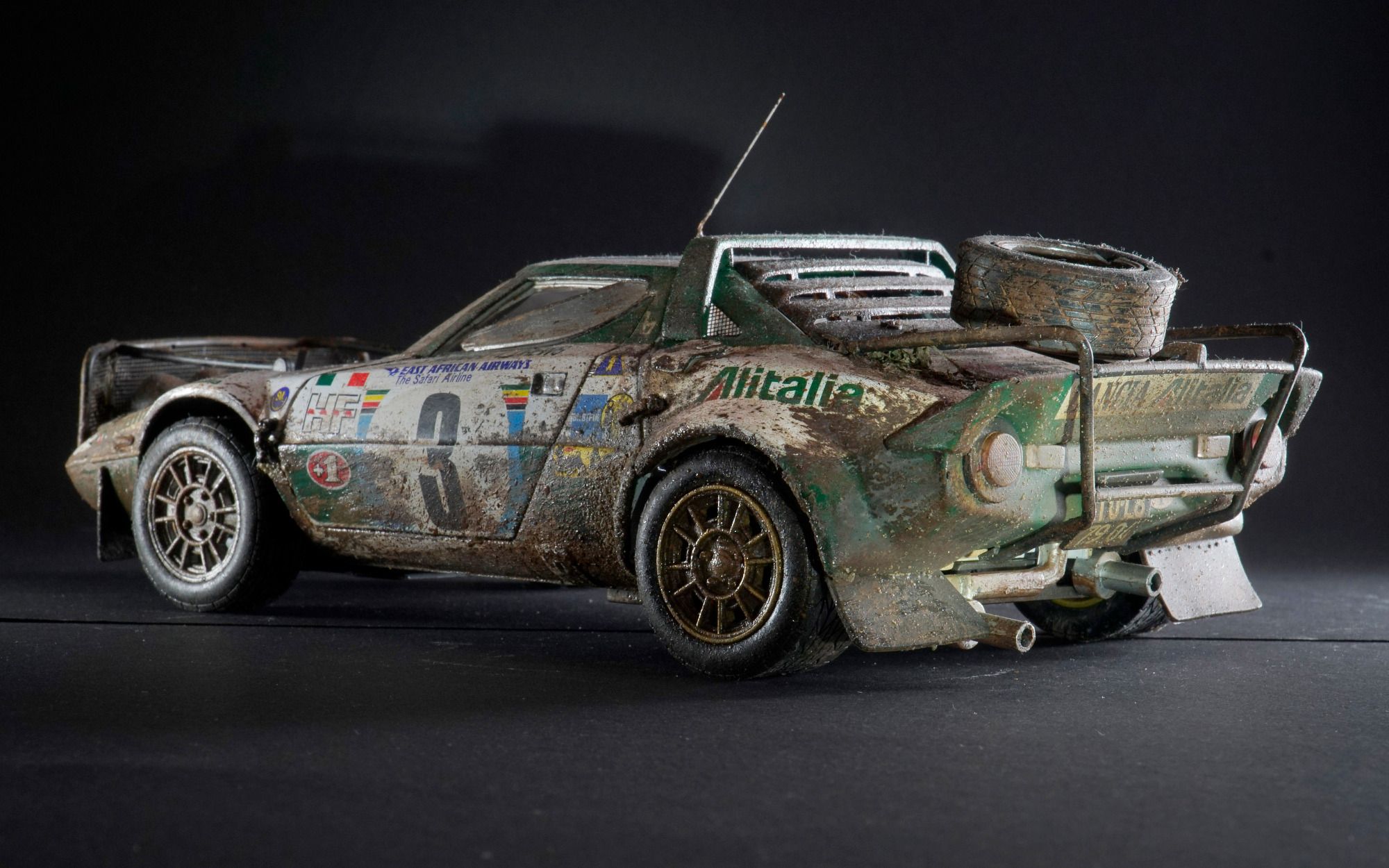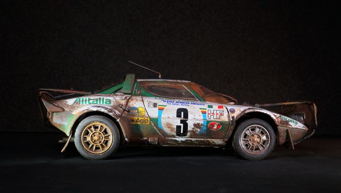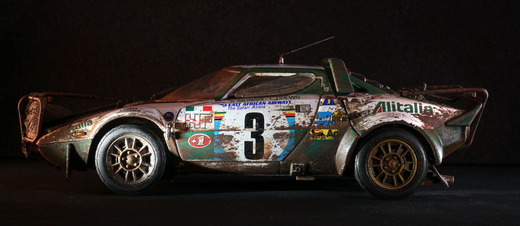 In 1975, Sandro Munari and his local navigator Lofty Drews finished second at the classic Safari Rally in Kenya - after challenging 5.927 km and 80 special stages. Their car. The extreme Lancia Stratos HF, here again, a great model from SunStar in 1:18.