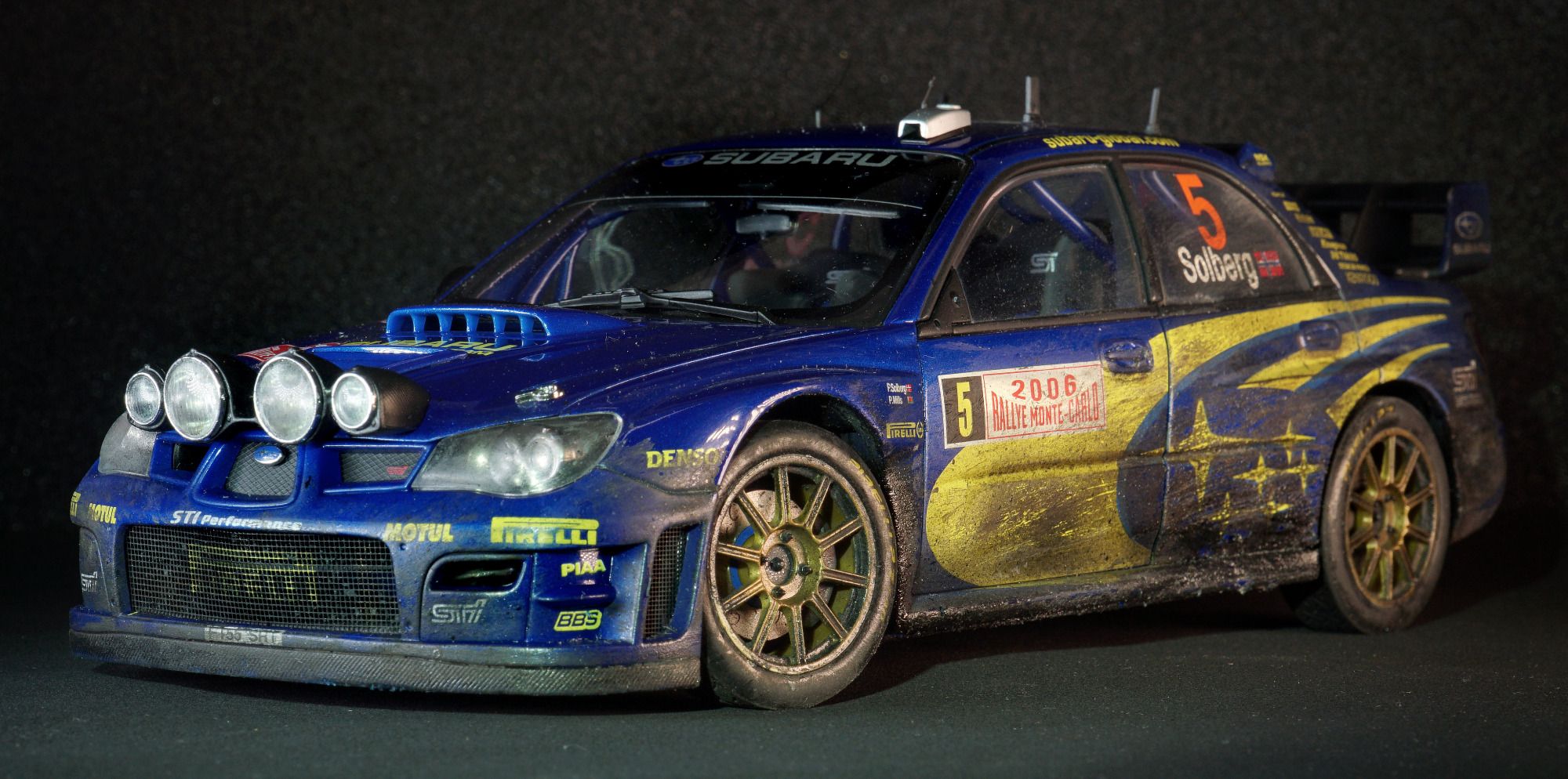 Hier das detaillierte - und ultra-rare - Modell von AutoArt, der Subaru Impreza von Petter Solberg und Beifahrer Phil Mills in der Night-Version der Rallye Monte Carlo 2006. Auf Kundenwunsch wurde nur die Fahrerseite bearbeitet, in einer Vitrine können so wahlweise die saubere, oder die STAGE-END Seite präsentriert werden.